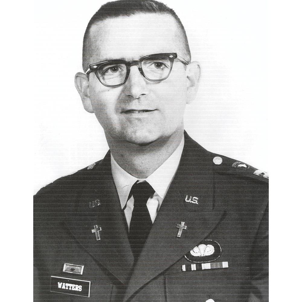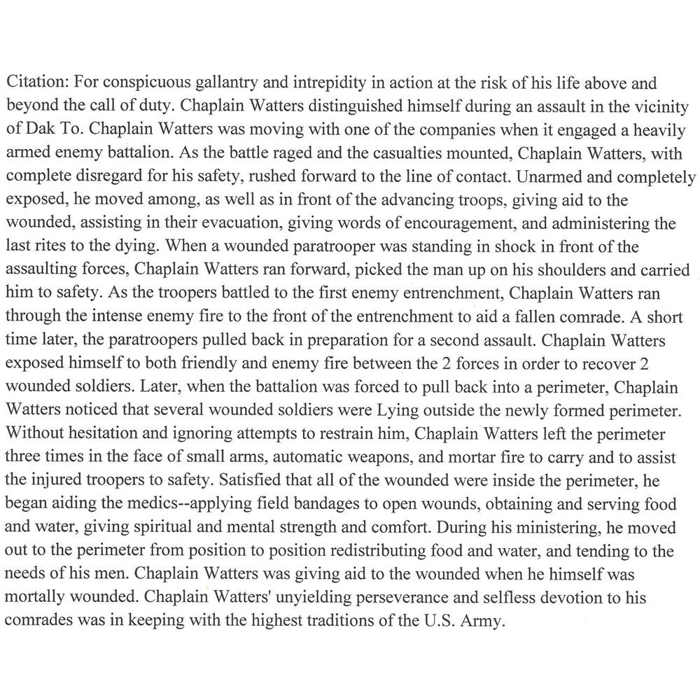 Chaplain Watters was the recipient of the Medal of Honor and the Bronze Star for his service in Vietnam. His citation reads in part, " as the battle raged and the casualties mounted, Chaplain Watters, with complete disregard for his own safety, rushed forward to the line of contact. Unarmed and completely exposed, he moved among, as well as in front of the advancing troops, giving aid to the wounded, assisting in their evacuation, giving words of encouragement, and administering last rights to the dying.... (He) was giving aid to the wounded when he himself was mortally wounded."