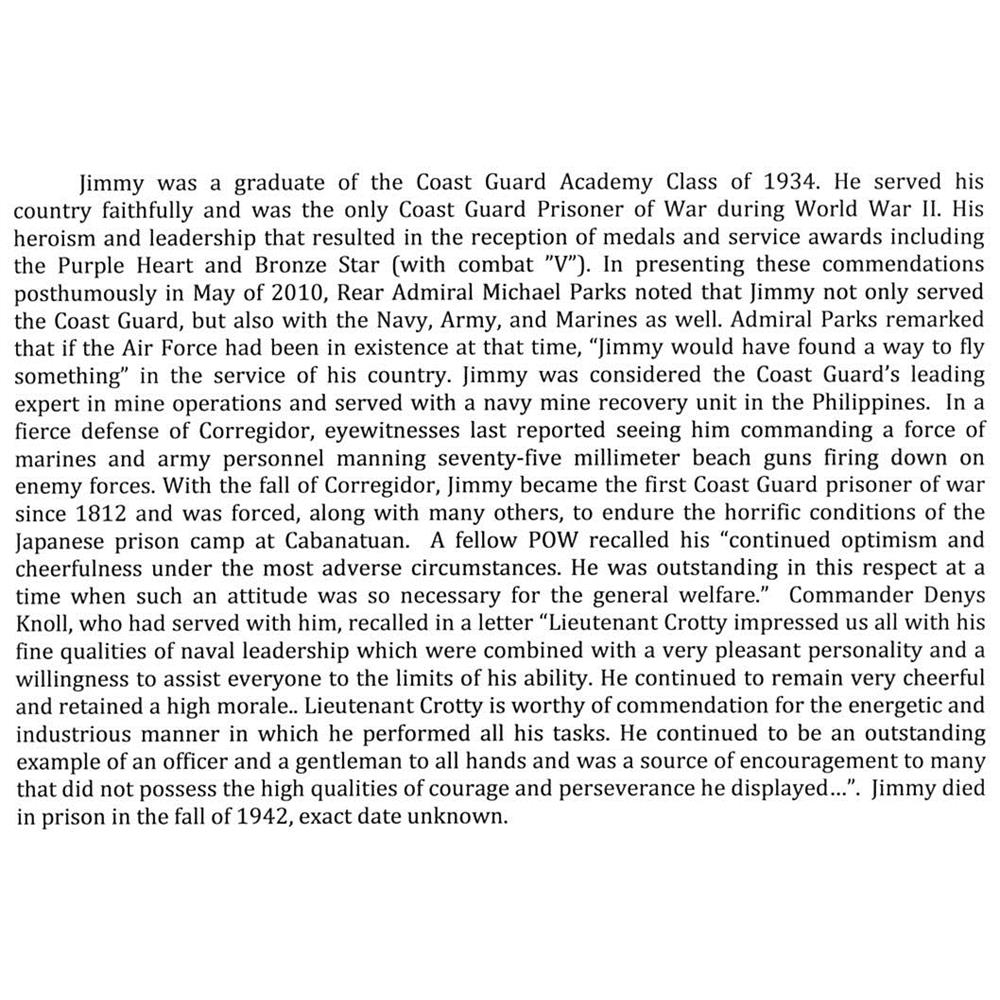 Lieutenant Crotty was the first Coast Guard Prisoner of War since the War of 1812, being captured upon the fall of Corregidor. He was a prisoner at Cabanatuan prison until he lost his life to a diphtheria epidemic that swept through his camp. He was buried in the camp. After the War, the remains of those buried at the prison were re-interred at the Manila American Cemetery. Due to the conditions of those remains, they could not be identified at that time, and were listed as "unknowns".